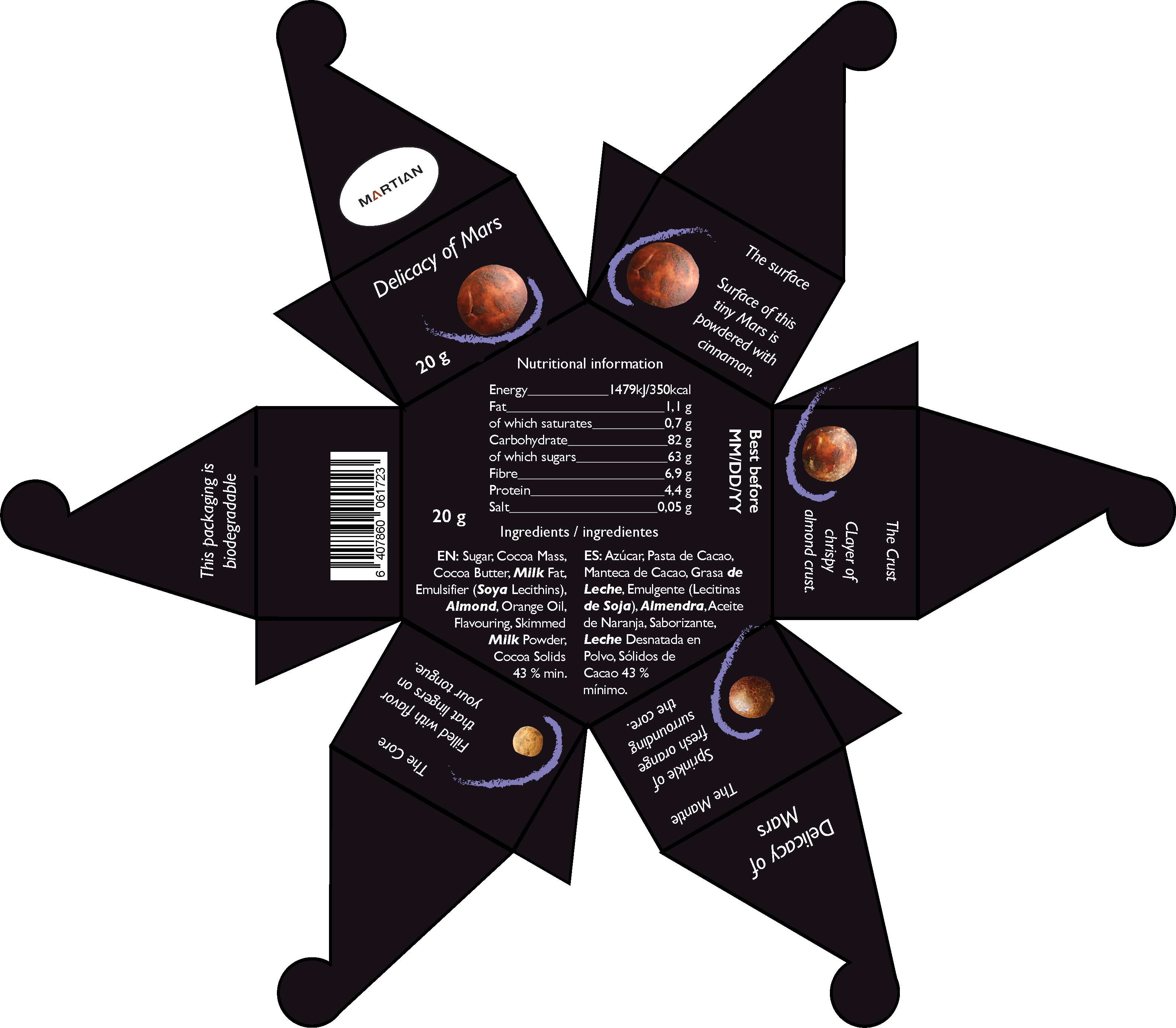 The package opened and with a mockup piece of the chocolate inside